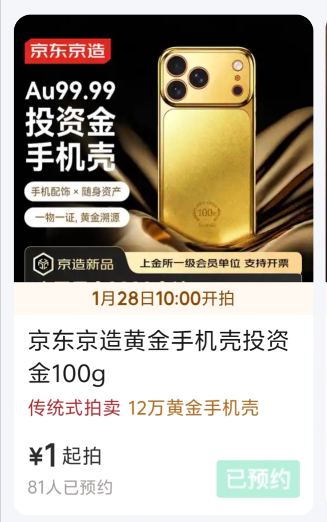 近日,有电商平台售卖黄金手机壳引发网友关注。1月23日,记者前往网上店铺发现,有价值约12万元的100克黄金手机壳,以起拍价1元的低价拍卖,每次加价最高200元,目前距离起拍还有5天,已经有81人交纳2000元保证金预约拍卖。
